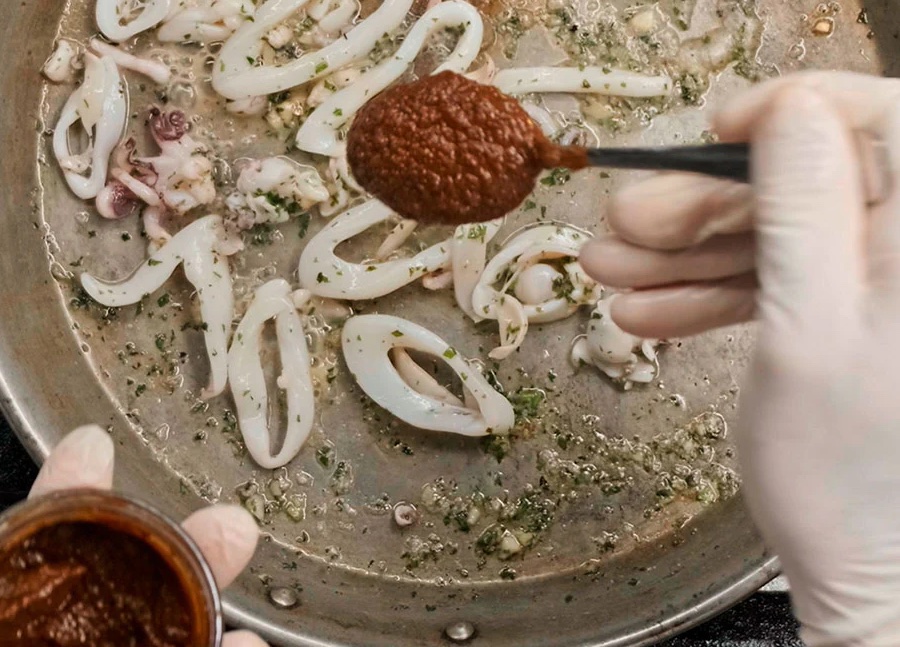 Para quienes sois unos apasionados de los arroces, fideuadas y guisos, recomendamos los sofritos con tinta de sepia o gamba de Palamós de Antoni Izquierdo, sumados al fumet de pescado de galeras.
