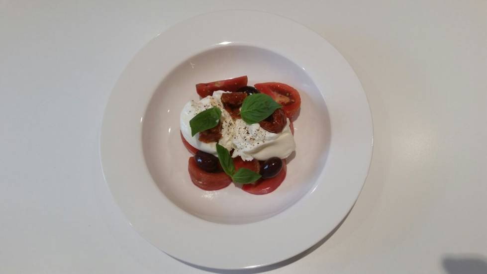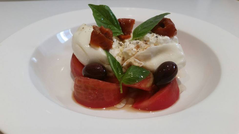 A més de la burrata, el plat es completa amb fulles d’alfàbrega, tomàquet d’amanir, tomàquet sec amb oli, olives Kalamata, vinagre cabernet sauvignon Flumen, oli oliva extra verge Flumen, sal maldon i pebre negre La Selecta.